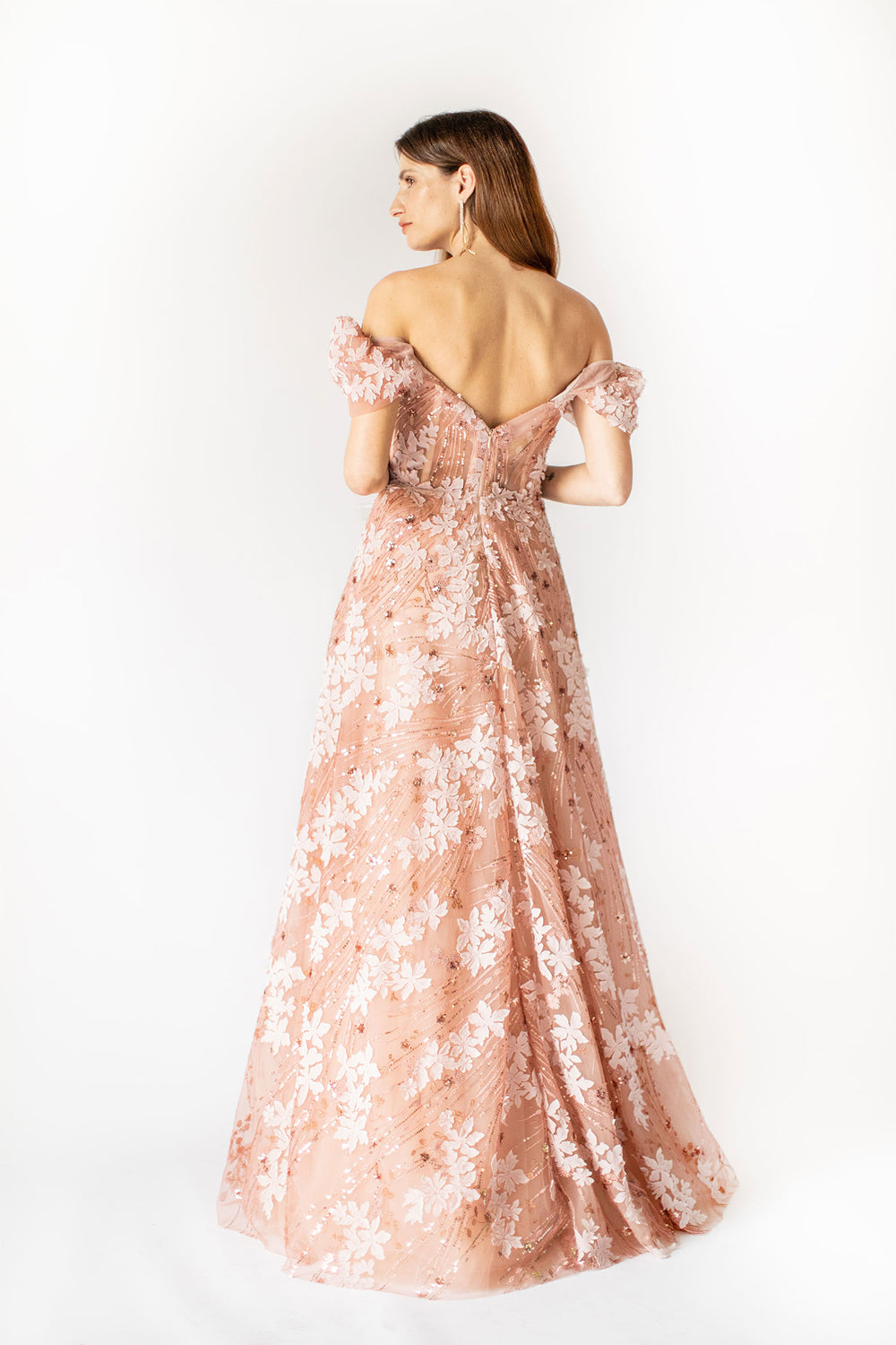 Indulge in the Coral Bloom Off-Shoulder Gown, an epitome of timeless elegance. This longer version of our enchanting strapless dress boasts captivating flower applications that cascade gracefully along the gown, coupled with an alluring off-shoulder neckline. The sweeping puffy skirt, adorned with layers of delicate tulle, adds a touch of fairy-tale romance to your every step. Perfect for making a statement at formal events, galas, or any affair where you want to radiate sophistication and charm.