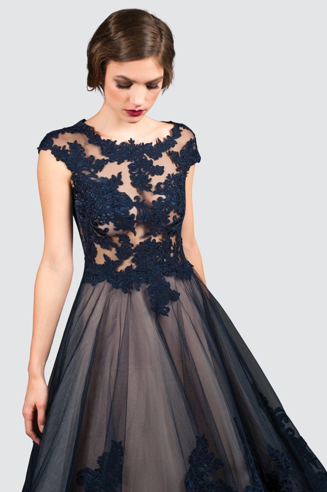 Embrace timeless elegance in this enchanting midi dress crafted in rich Mystery lace over a soft Vanilla lining. The illusion tulle bodice features exquisite floral embroidery appliqués that cascade delicately across the front and back, creating a romantic sheer effect while maintaining sophisticated coverage. Cap sleeves and a fully embroidered lace back add refinement, while the airy soft tulle skirt falls to mid-calf with scalloped embroidery trimming along the hem for a dreamy, floating finish.