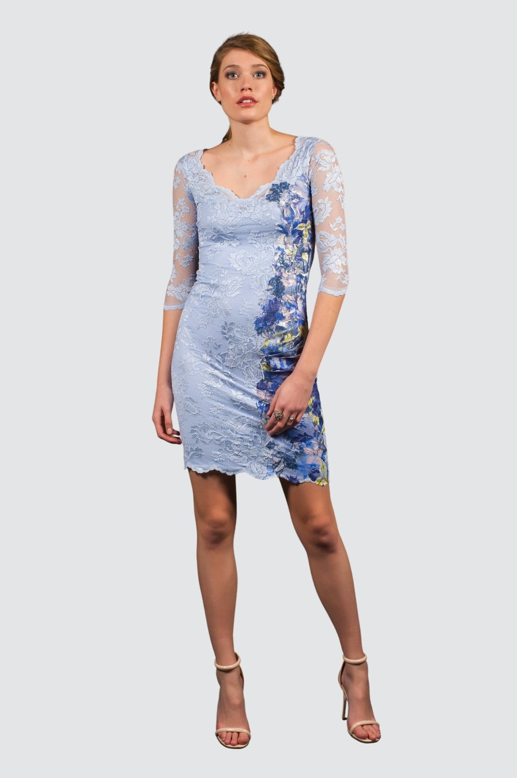 Embrace timeless elegance in this enchanting midi cocktail dress, crafted in exquisite floral lace over a soft lining. The delicate scalloped sweetheart neckline and translucent back create a romantic and alluring effect while keeping coverage refined. Graceful 3/4-length sleeves add sophistication, and the show-stopping asymmetric floral side application that flows from bodice to hem brings artistic depth and movement to the fitted silhouette. Finished with a subtle scalloped hem at mid-calf length.