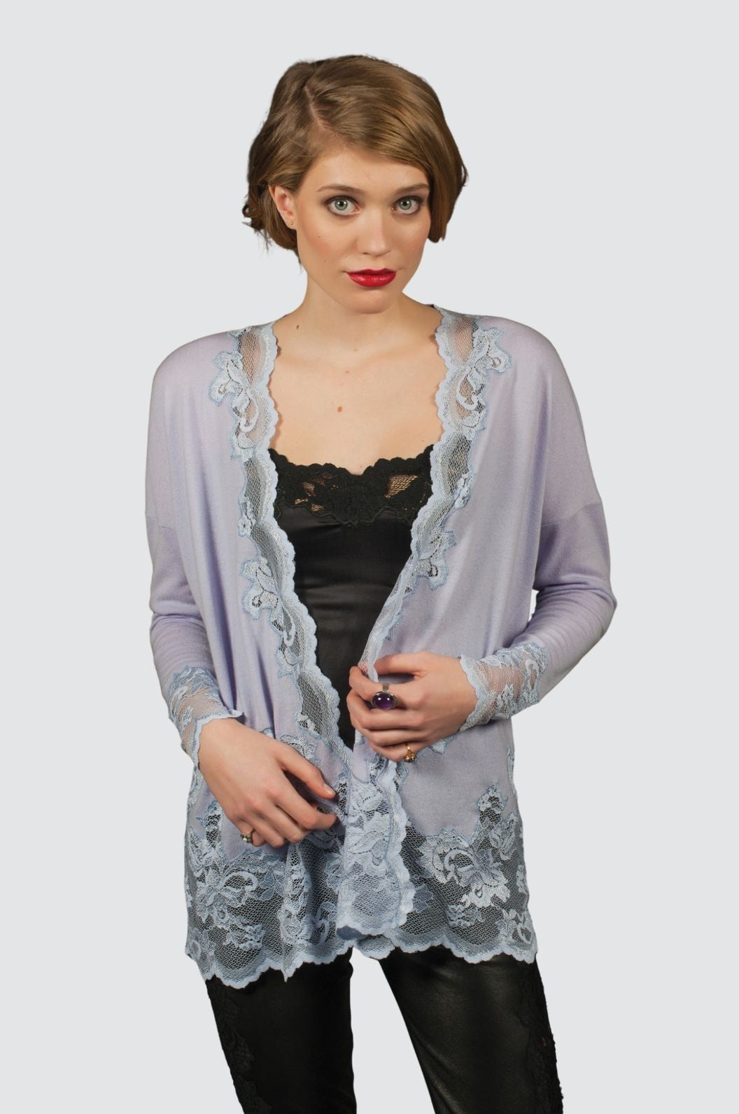 Each intricate lace appliqué is meticulously placed for a romantic, almost couture-like effect, creating a stunning contrast against the refined cashmere. No buttons or closures – it falls open effortlessly for effortless layering over silk camisoles, lace tops, or evening dresses. Available in Cement, White, Pearl, and Pastel Lilac.