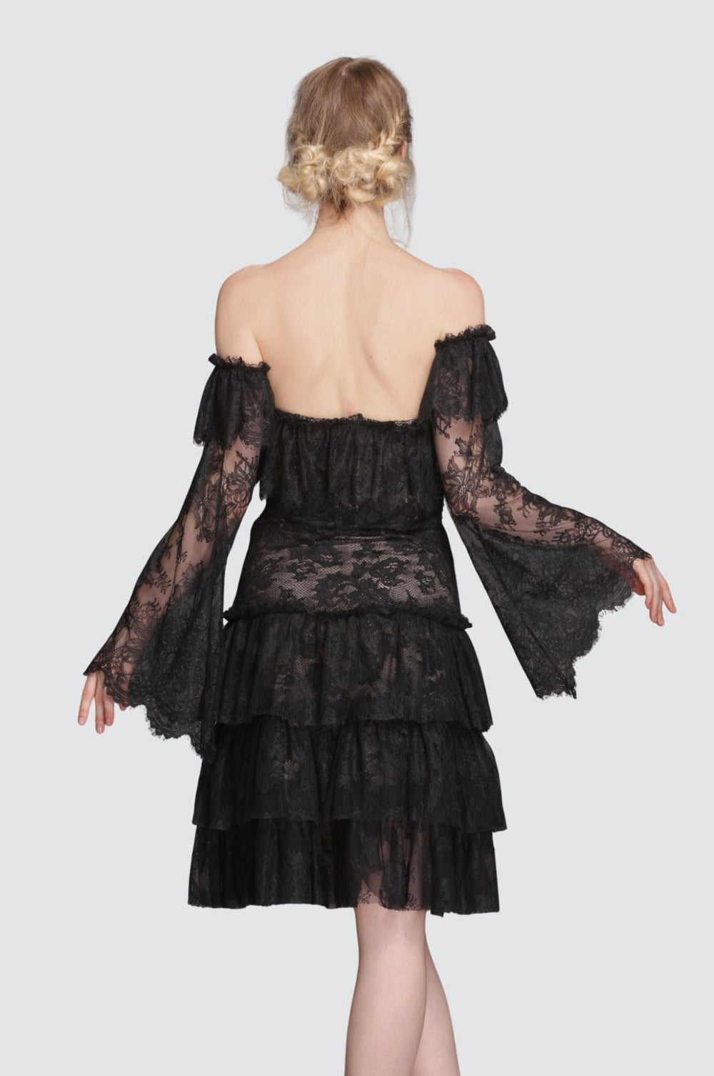 Schwarzes schulterfreies Rüschenkleid aus Netzstoff