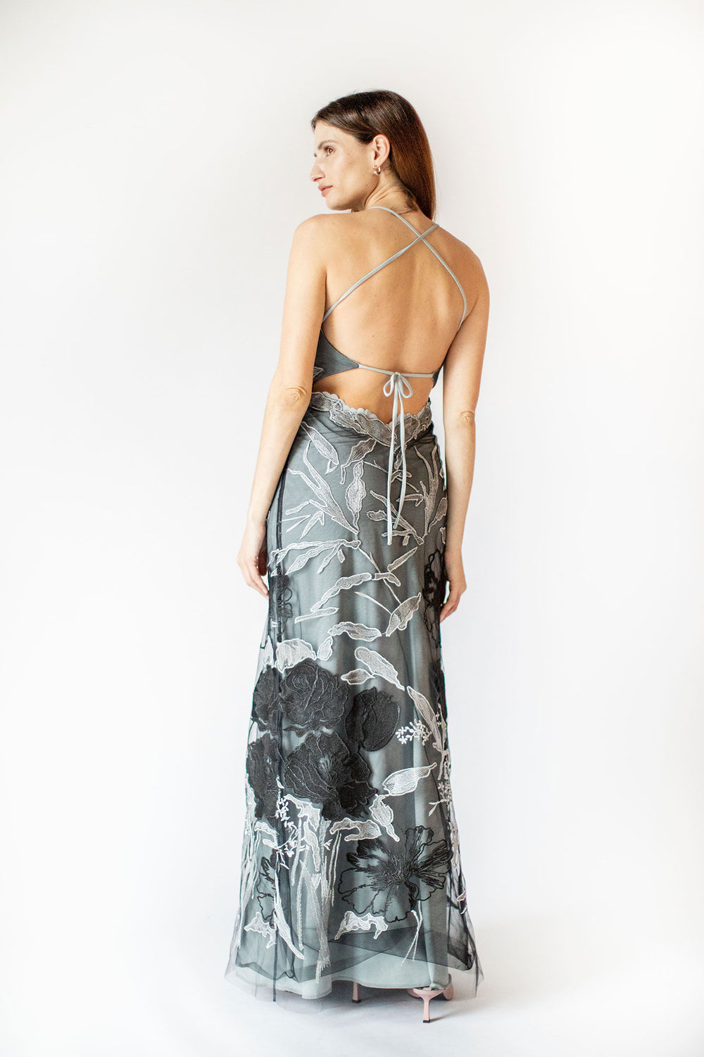 Graues Tüllkleid mit Cut-Out-Stickerei