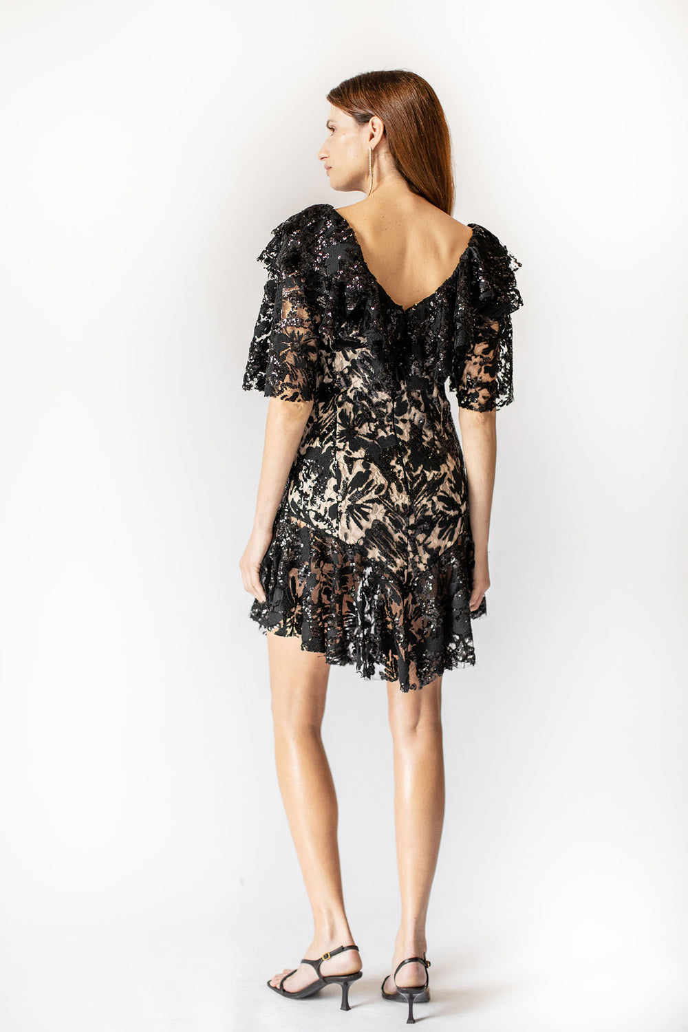 Lassen Sie sich von der bezaubernden Schönheit unseres schwarzen Noir Blossom Flocked Embroidery Floral Dress begeistern – ein bezauberndes Stück, das den zeitlosen Charme der Flockstickerei mit einem modernen Blumenmotiv vereint. Dieses Kleid ist ein Ausdruck aufwendiger Handwerkskunst und eleganter Eleganz.