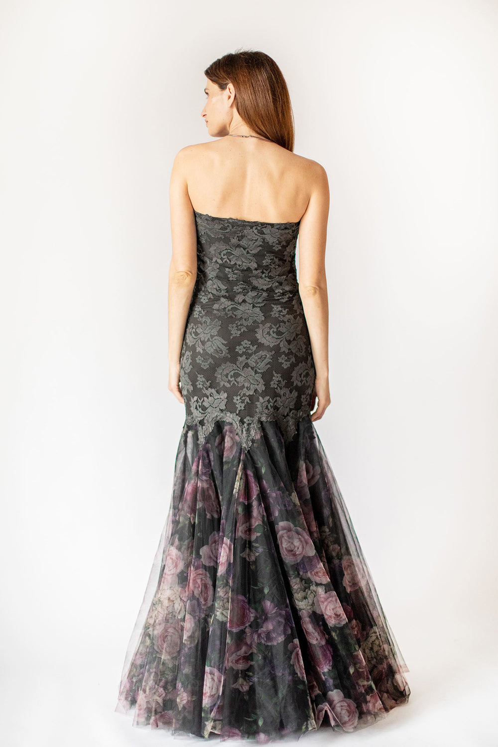 Verwöhnen Sie sich mit unserem bezaubernden Floral Dreams Meerjungfrauen-Spitzenkleid mit Tüllakzent – ein dekadentes Meisterwerk aus luxuriöser Faille, verziert mit dem bezaubernden Blumenmuster der Saison. Dieses Kleid besticht durch seine trägerlose Silhouette, den U-Ausschnitt und den bodenlangen Saum mit kurzer Schleppe und bietet eine jugendlich-elegante Interpretation abendlicher Eleganz.