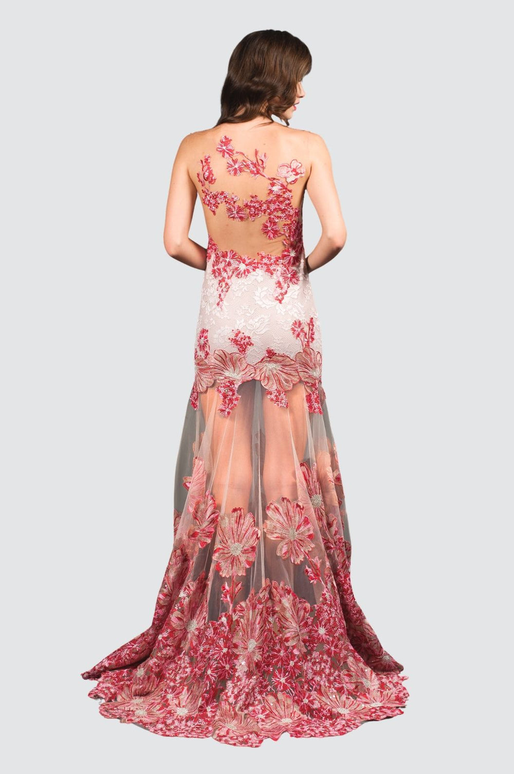 Erleben Sie Eleganz mit diesem bezaubernden bodenlangen Kleid, das einen bleibenden Eindruck hinterlässt. Der durchsichtige Rock verleiht einen modernen, gewagten Touch und bewahrt gleichzeitig Anmut und Eleganz. Mit zarten Blumenapplikationen verziert, bietet dieses Kleid romantisches Flair und verbindet Weiblichkeit mit kühnem Stil. Die aufwendigen Details an Oberteil und Rock sorgen für einen atemberaubenden visuellen Effekt – perfekt für Hochzeiten, Galas und andere wichtige Veranstaltungen.