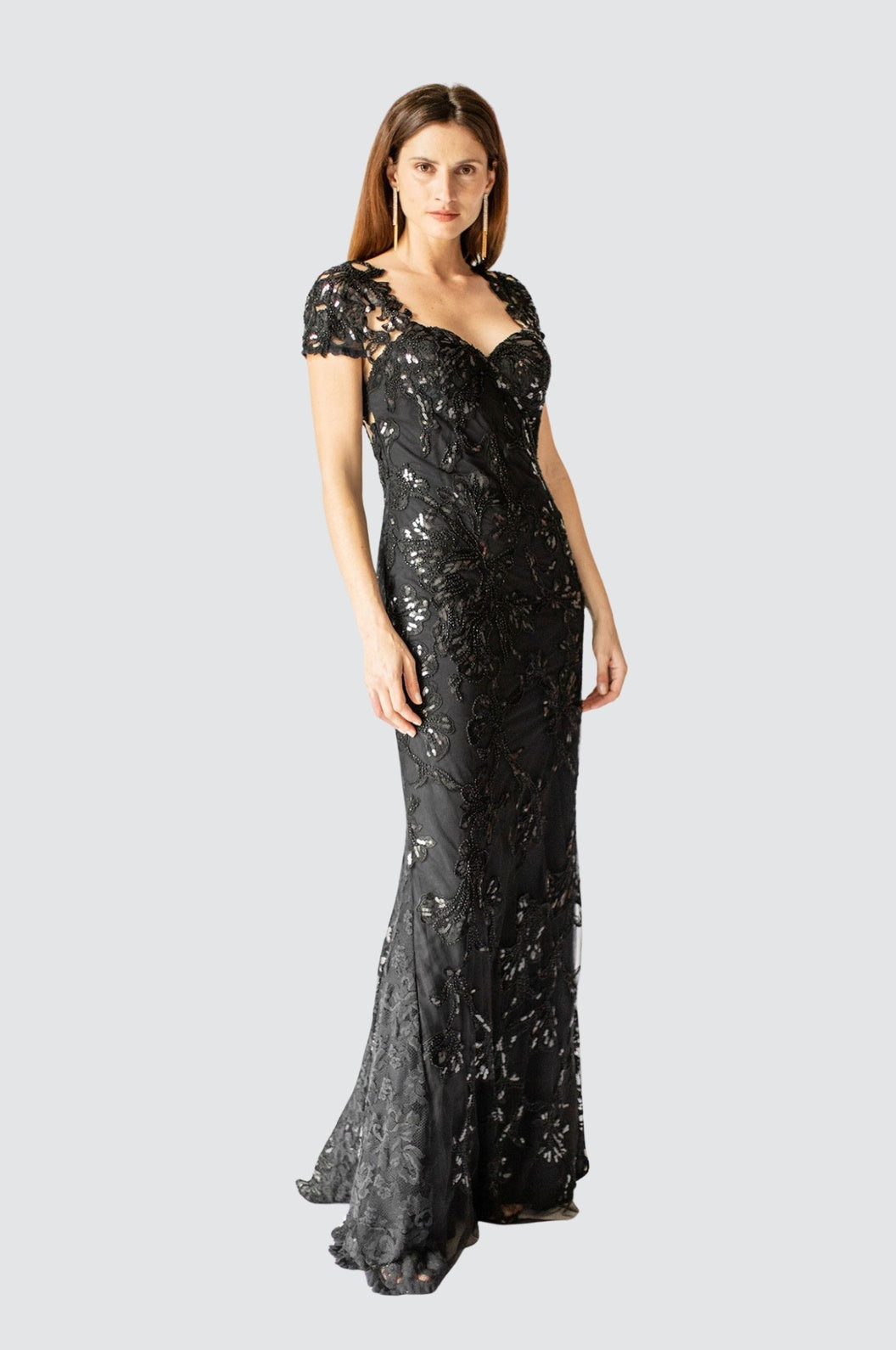 Für einen unvergesslichen Auftritt bei Hochzeiten, Galas oder anderen besonderen Anlässen ist das mit Pailletten besetzte Kleid aus floraler Spitze mit offenem Rücken und Paillettendetails „Enchanted Blooms“ der Inbegriff von Anmut und Stil.