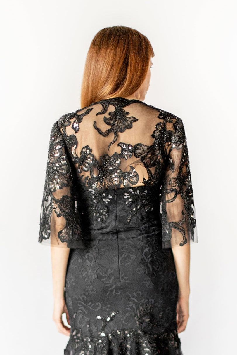 Veredeln Sie Ihr Ensemble mit unserem Midnight Bead-Embellished Sequins Black Bolero Tulle – einer exquisiten Bolerojacke, die die Pracht von Perlenverzierungen und Pailletten mit dem zeitlosen Charme von schwarzem Tüll verbindet. Dieses vielseitige Stück verleiht jedem formellen Outfit einen Hauch von Raffinesse und verwandelt Ihren Look mit opulenten Details.