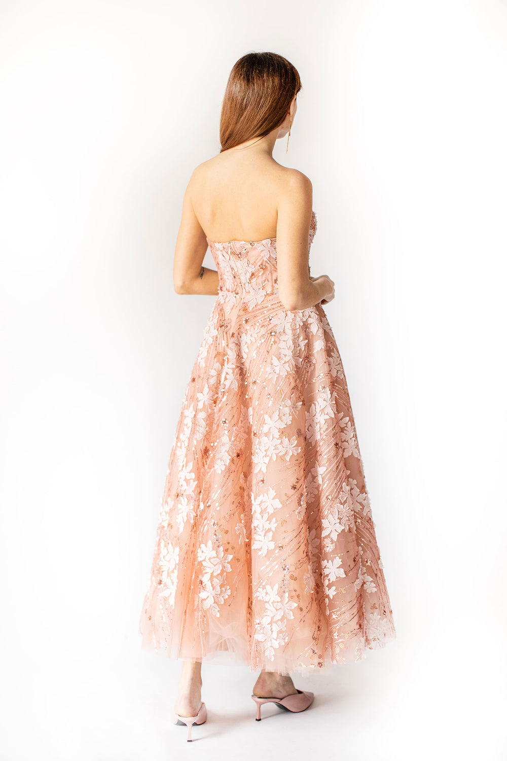Sublimez votre élégance avec notre robe bustier Coral Bloom Enchantment, un ensemble envoûtant qui allie harmonieusement sophistication moderne et romantisme intemporel. Cette robe bustier vous fera sentir comme une fleur éclose grâce à ses applications florales exquises et à sa somptueuse jupe bouffante ornée d'un tulle aérien.